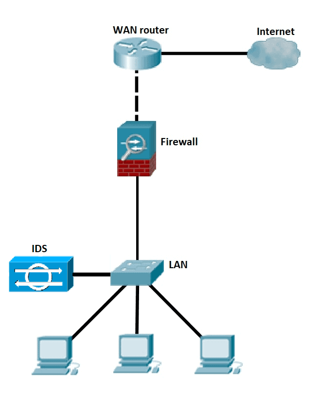 1. Network Intrusion Detection System (NIDS): Network intrusion detection systems (NIDS) are set up at a planned point within the network to examine traffic from all devices on the network. It performs an observation of passing traffic on the entire subnet and matches the traffic that is passed on the subnets to the collection of known attacks. Once an attack is identified or abnormal behavior is observed, the alert can be sent to the administrator. An example of a NIDS is installing it on the subnet where firewalls are located in order to see if someone is trying to crack the firewall.